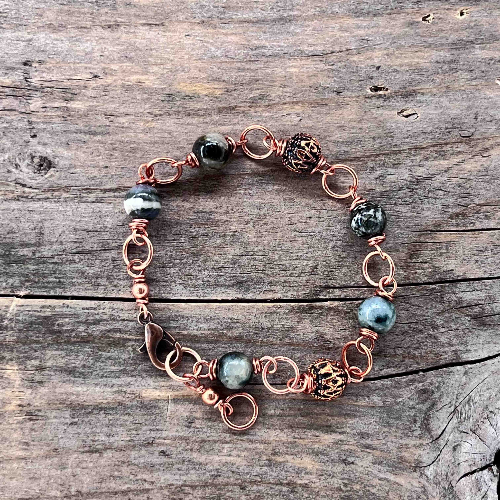 Det fine med kobber, er at det blir mørkere over tid. Puss armebåndet med en myk, litt fuktig klut innimellom for å få frem glansen igjen.
