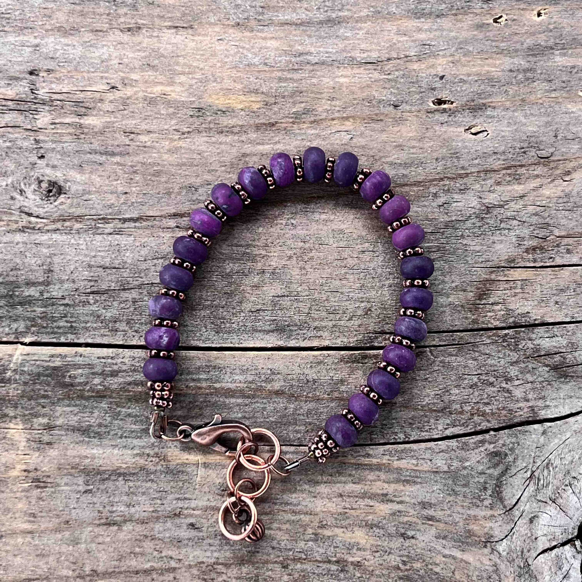 Det fine med kobber, er at det blir mørkere over tid. Puss armebåndet med en myk, litt fuktig klut innimellom for å få frem glansen igjen.