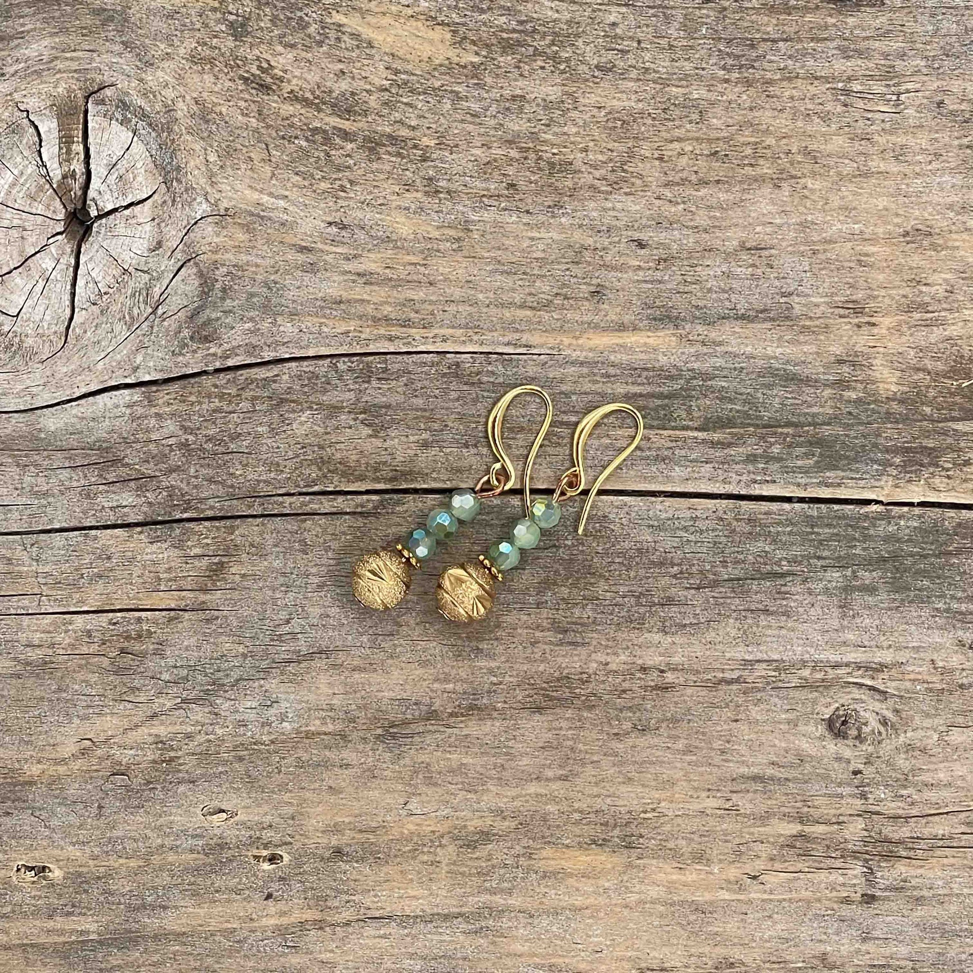 Perler av glass, messing og gullbelagt kobber. Messing wire. Nikkelfrie kroker.