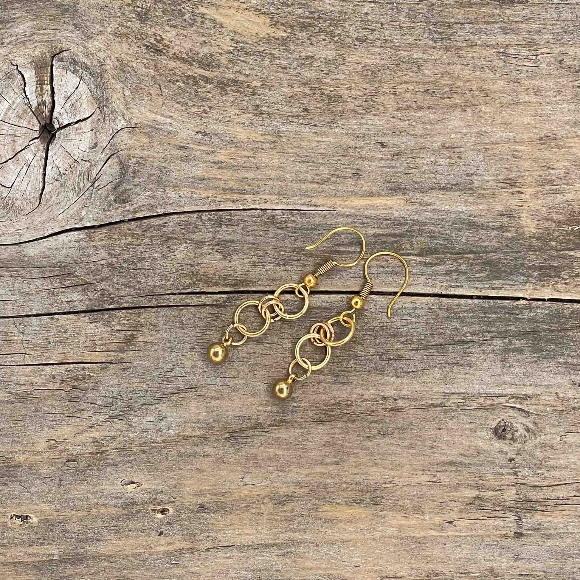 Perler av glass, messing og gullbelagt kobber. Messing wire. Nikkelfrie kroker.
