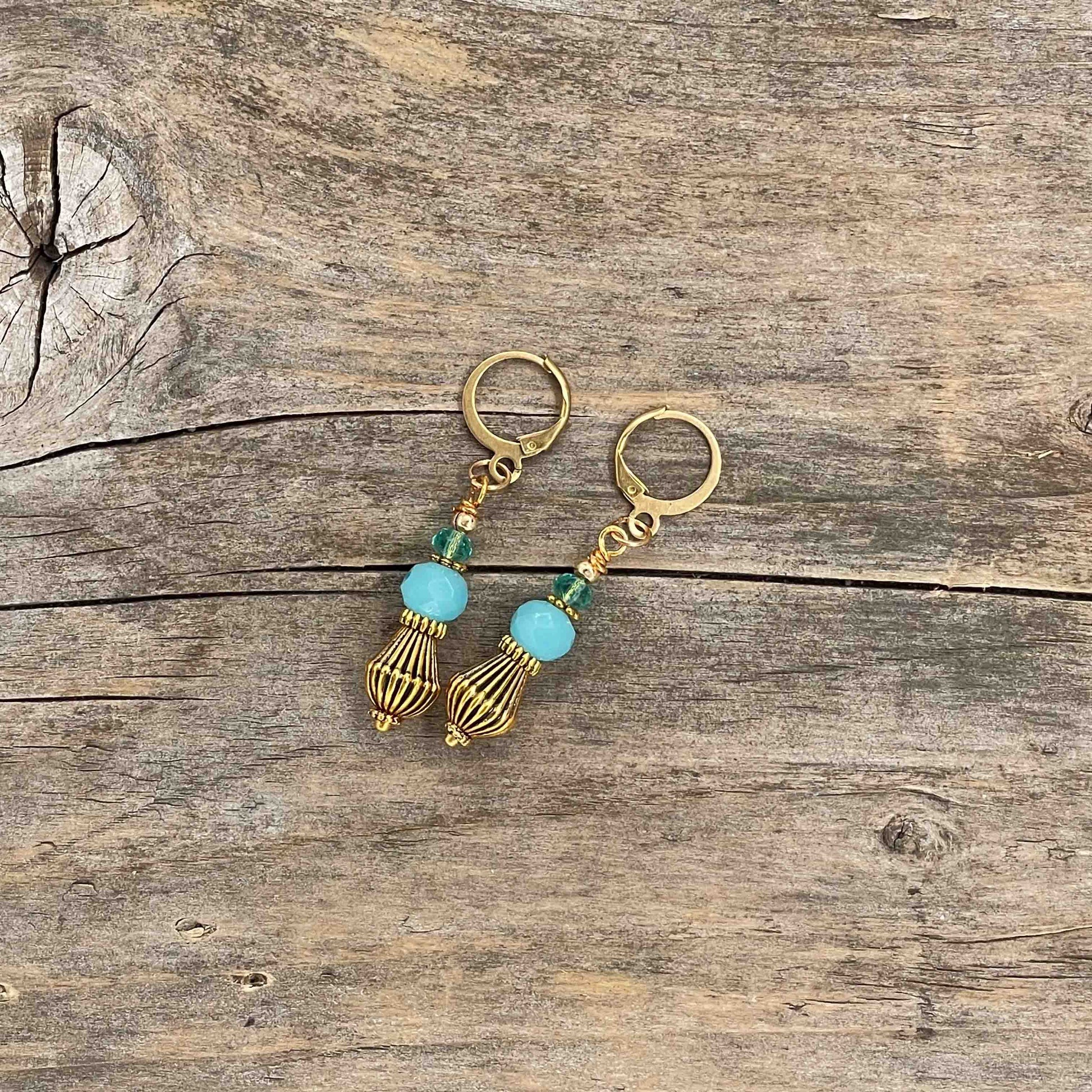 Perler av glass, messing og gullbelagt kobber. Messing wire. Nikkelfrie kroker.