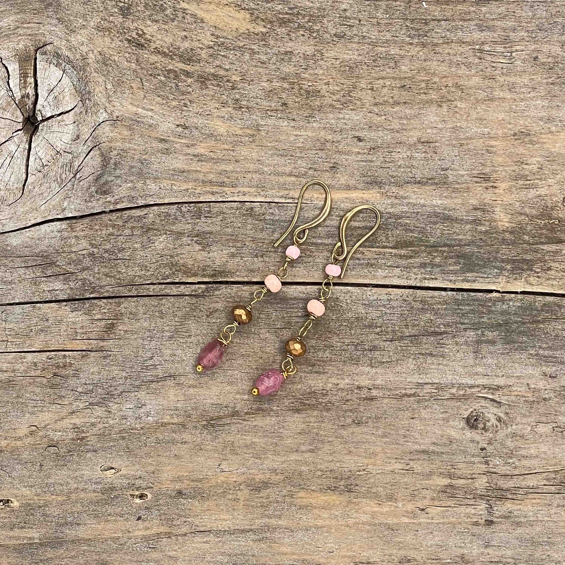 Perlene er av ekte stein, messing eller gullbelagt kobber. Messing wire. Nikkelfrie kroker.