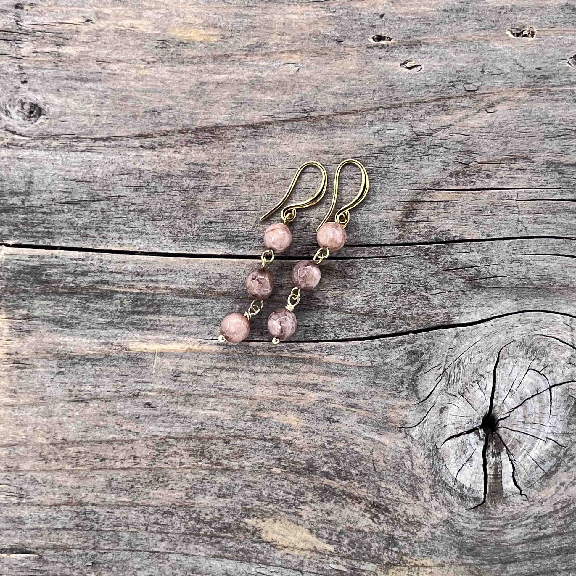 Perlene er av ekte stein, messing eller gullbelagt kobber. Messing wire. Nikkelfrie kroker.
