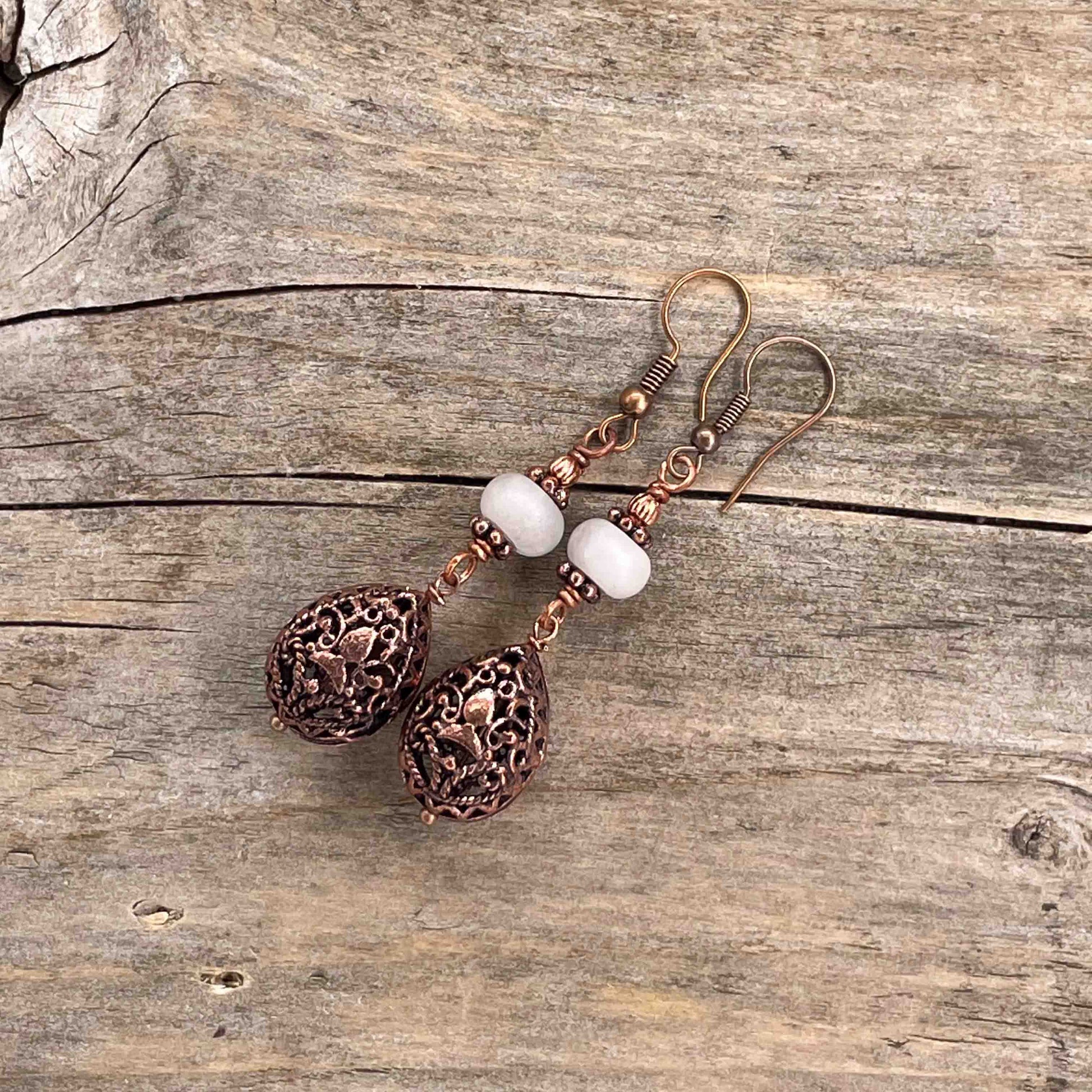 Perlene er av ekte steiner, glass eller og kobber. Kobber wire. Nikkelfrie kobber kroker.